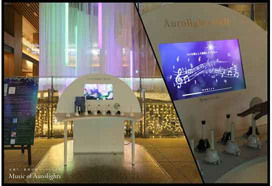 本イベントの核となるのは、来場者がハンドベルを奏でることで始まるインタラクションです。アーティスト集団・knoctaveが開発したAIシステム「StripeTrack」を基盤にしたシステムを開発。演奏された音を分析し、500以上のパターンから "あなただけのカラー" を生成します。選ばれた音色が、目の前のオーロラに光として映し出され、まるで自分自身の音が空間に命を吹き込むような体験をつくり出します。