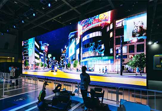 ②モビリティが進化することで道や街など都市構造、また自然との関わり方が変化する様を展示空間と超大型LED映像によるリアルとデジタルの融合で表現。