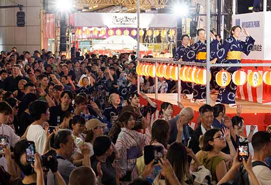 第6回渋谷盆踊りは、2025年8月2日(土)に渋谷109イベントスペースおよび周辺公道(道玄坂・文化村通り)にて開催された。本イベントは、渋谷道玄坂地域住民同士の結び付きを深めるとともに、日本の伝統文化である盆踊りを通じて交流と賑わいを創出することを目的に継続実施している。主催は渋谷区道玄坂商店街振興組合、渋谷区および観光協会等が協力し、民間と行政が連携した街づくりを体現する取り組みである。渋谷警察と緊密に連携し、渋谷スクランブル交差点周辺を長時間交通規制して実施する点は、都市機能と共存する大規模イベントとして特筆すべき特徴である。昼間の交通規制は他イベントでも見られる一方、夜間に渋谷スクランブル交差点周辺を長時間規制する取り組みは本大会のみであり、渋谷における唯一無二の事例である。当日は多様なステージ演出、縁日、キッチンカー出展に加え、著名人の特別出演や伝統的な点灯式を実施。来場者は約62,000人、そのうち外国人比率は3割を超え、国際色豊かな交流の場として、渋谷を代表する夏の恒例行事へと発展している。
