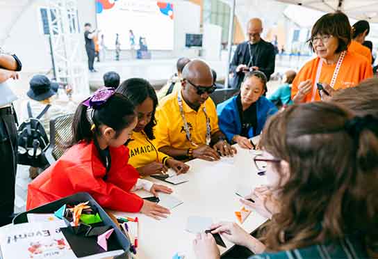 Hello!おもてなしジュニアは、子どもを来場者ではなく"主催者側"として位置づけ、日本文化でのおもてなしを通じて海外ゲストを迎える国際交流イベントです。子どもや障がいの有無、置かれた環境に関わらず、誰もが役割を持って参加できるインクルーシブなイベント形態で実施しています。大阪・関西万博での実施では、子供たちが和装で海外からのゲストをもてなし、日本文化紹介や交流を主体的に担当しました。子供たちは事前研修で伝統芸能や地域文化について学び、理解した上で海外ゲストへ紹介を行いました。文化を"体験する"だけでなく"伝えるために学ぶ"プロセスを通じ、日本文化の理解と次世代への継承にもつながる設計としています。子どもがホストとなることで来場者との心理的距離が縮まり、大人による接客以上に自然な交流が生まれ、外国人ファミリー層にも高い評価を得ました。また、大学病院に入院中の子供たちがアバターやロボットを通じて遠隔参加する「ホスピタルジュニア」を実施し、入院児が来場者への文化紹介を担う"おもてなし側"として参画しました。来場者から50通以上の感謝の手紙が病院へ届けられ、遠隔環境においても社会的役割を担えることを実証しました。大学、社会福祉協議会、大阪府警察、シニア等との共創体制は拡大を続けており、今年4月からは京セラドーム大阪などのスポーツ施設でのおもてなしの展開等も行って参ります。